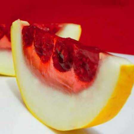 Дыню режем пополам, очищаем от семян, из апельсина, разрезанного также пополам вынимаем мякоть. Заполняем полученные емкости наполовину малиной. Можно не возиться с желатином, а сварить желе из готовой смеси, охладить, залить ягоды в дыне и апельсине, поставить на ночь в холодильник. Достаточно 3:00. Чтобы содержимое не разлился, каждую половинку фрукта можно поставить на низкую чашку или стакан.
