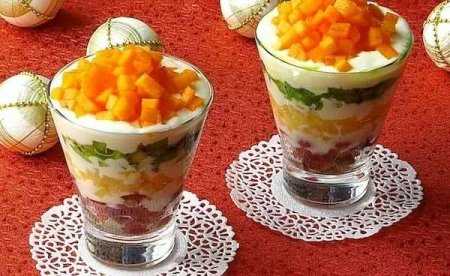 Хурму выложить на йогурт горкой. К салату подать десертные ложки.