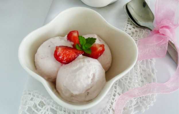Очистить, помыть клубнику и протереть ее. Добавить йогурт и взбитые сливки в клубничное пюре. Смешать до однородности. Добавить сахарную пудру по вкусу. Залейте смесь в коробку и положить в морозильную камеру. Мешайте несколько раз в течение 30 минут, чтобы предотвратить образование крупных кристаллов льда.