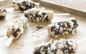 Замороженные бананы опускают в расплавленный шоколад с одной стороны (или целиком).