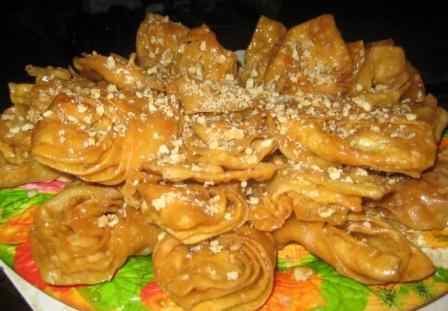 3. Сироп: растопить сахар и мед в воде, довести до кипения. В кипящий сироп опускать жареное тесто на 2 минуты. Вынуть и дать остыть. Сверху можно посыпать измельченными грецкими орехами.