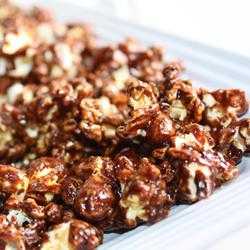 Смешайте сахар, кукурузный сироп, какао-порошок и масло в другой кастрюле на среднем огне, пока смесь не закипит. Варить в течение 2 минут. Положить ваниль и залить смесью попкорн и арахис. Мешайте попкорн, пока он хорошо не покроется смесью. Распространите попкорн в подготовленной форме. Накройте крышкой.<
