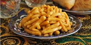 Затем соломку перемешать с сиропом, придать чак-чаку любую форму и украсить что есть у вас в наличии изюмом и курагой.