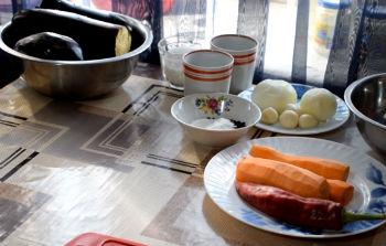 В перетертую морковь добавляем чеснок и горький перец. Все овощи готовы к консервации. В хорошо вымытые пол литровые баночки, первым слоем укладываем баклажаны, вторым слоем – морковь с чесноком и перцем, далее выкладываем лук и так до самого верха чередуем слои.
