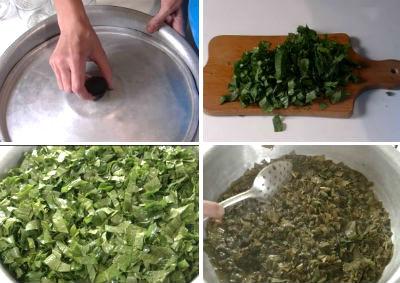 Далее в миску наливаем пол литра проточной воды и ставим на огонь закипать. Как только вода закипит, высыпаем щавель в миску с кипятком, до самого верха, столько, сколько влезет, т.е. под крышку. По желанию можно добавить зелень (петрушку, укроп и т. д.). Прикручиваем огонь, накрываем щавель крышкой и даем время ему хорошенько пропариться.