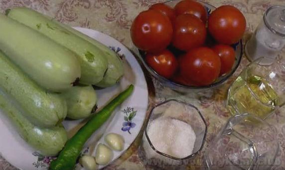 Помидоры, чеснок, горький перец – все эти ингредиенты перекручиваем на мясорубку. Кабачки нарезаем не слишком мелкими кубиками, можно порезать соломкой и даже дольками, в общем кому, как нравится. После того, как все кабачки нарезаны, берем кастрюлю и выливаем в нее смесь из помидор, перца и чеснока. В этот овощной состав добавляем 1 ст. ложку соли, 4 ст. ложки сахара, растительное масло и 4 ст. ложки уксуса. Всю томатную смесь тщательным образом перемешиваем и высыпаем в нее нарезанные кубиками кабачки. Еще раз все хорошенько перемешиваем.