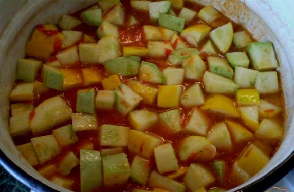 Далее ставим кабачки на огонь и доводим до кипения. В процессе закипания, не забываем нашу заготовку помешивать. Как только кабачки закипели, убавляем огонь и варим примерно 40-45 минут на среднем огне. Проверьте, чтобы кабачки были мягкими, но не переварились. Кусочки должны быть целыми.