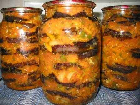 Вытащить баклажаны из рассола, дать рассолу стечь через дуршлаг и уложить слоями в банку. Чередовать слой баклажанов, слой приготовленной смеси. Укладывать плотно.