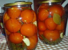 Для приготовления помидоры хорошо вымыть и обсушить. С помощью деревянной палочки или зубочистки проколоть сверху (не до конца), чтобы помидоры не лопались. Сложить овощи в чистую, стерилизованную банку, предварительно на дно банки выложить укроп, перец, чеснок, лавровый лист, порезанный лук. Залить все содержимое кипящей водой и оставить на 8-10 минут.