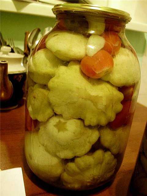 Для приготовления ассорти нам нужны патиссоны, капуста цветная, перец болгарский и острый, чеснок, соль сахар, приправы и уксус. На один литр заливки нужно 50 г соли, 100 г сахара одна столовая ложка уксуса. Приправы можно брать по вкусу. Цветную капусту бланшировать 4 минуты в кипящей воде.
