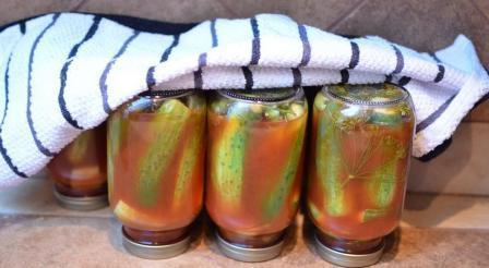 - Залейте снова огурцы и закатайте банку железной крышкой, переверните и накройте одеялом. Огурцы хорошо пропарятся и не взорвут даже без стерилизации. После того как банки остынут, отнесите их в кладовку или подвал.