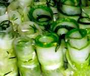 Через 24 часа огурцы выньте (они станут уже мягкими), сверните вместе с зеленью и чесноком рулетиками и плотно уложите в стерилизованные банки, на дно которых тоже выложите свежие листья смородины. Рассол процедите, прокипятите и снова залейте огурцы в банках, сверху прикройте свежими листьями смородины и закройте банки полиэтиленовыми крышкками.