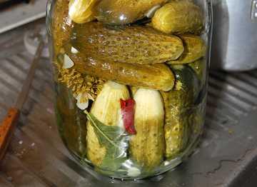 На одну трехлитровую банку кладем 2-3 зубчика чеснока, 1-2 зонтика семян укропа, по 3-4 листа смородины и вишни, несколько кусочков хрена, кусочек горького перца.