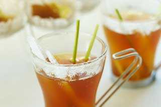 Разлейте чай по стаканам, на высоту около 1/3. Добавьте по 30 г водки в каждый стакан и хорошо перемешайте. Положите лед и подавайте.
