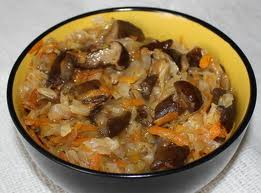 Между тем в капусту следует добавить томатную пасту, сахар, соль, смесь перцев свежеизмельченную, винный уксус. Перемешать и тушить еще 20 минут. К пассерованному луку добавить ломтики грибов, перемешать, немного обжарить.