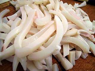 Остывших кальмаров выньте из бульона, нарежьте соломкой. Бульон процедите.