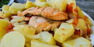 Килограмм форели филитировала. К ней 7 молодых картошек, 6 помидорок, 2 луковицы, прованские травы в баночке с мельничкой, имеретинский шафран (обязательно), соль, 4 зубчика молодого чеснока и булочка ржаного хлеба - для гренок. Масло растительное немножко.