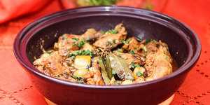 За 10-15 минут до готовности, добавить оливки и мелко нарезанную зелень. Готовый тажин разложить по тарелкам вместе с вареным рисом.