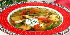 Добавьте картофель, через 10 минут — баклажаны, пассерованные овощи, черный перец, аджику, сахар, соль и варите еще 5 минут. Положите зелень, доведите до кипения, снимите с огня. При подаче положите сметану.