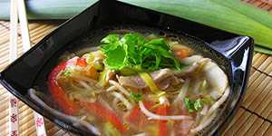 Перец, луковицу и лук-порей нарезать соломкой, тушить вместе с грибами в растительном масле около 5 минут. Затем влить куриный бульон, добавить лапшу, соевый соус, соль, имбирь по вкусу. Положить кусочки куриной грудки, суп готов.