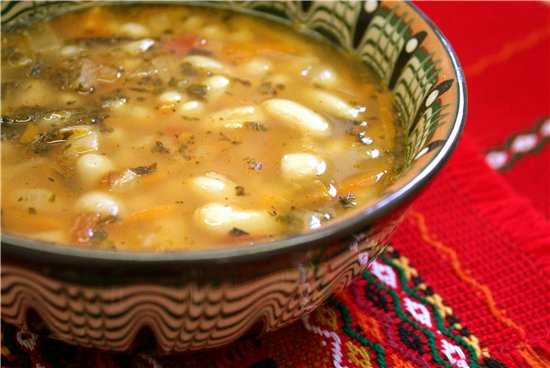 Когда фасоль почти сварится, вылить заправку в суп, посолить, всыпать сухую мяту, дать покипеть несколько минут, снять с огня, дать настоятся хотя бы 20 минут и подавать.
