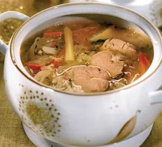 Нарезанный картофель положить в горшочек с бульоном и варить 10-15 минут. Добавить промытое пшено, тушеную капусту и варить до готовности.