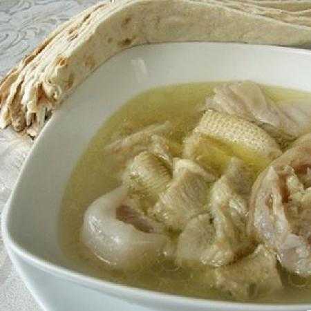 Очистить рубец, вымыть, отдельно отварить до готовности, нарезать кусочками и добавить к варящимся ножкам. На медленном огне продолжать варить хаш без соли, снимая пену и не допуская сильного кипения.
