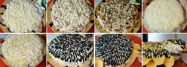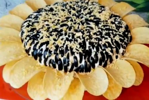 Далее оливки разрезаем на восемь частей и выкладываем их по всех поверхности, в виде семечек. На украшение уйдет минут 15, зато за это время салат успеет пропитаться и его сразу же можно будет подать к столу. В завершении выкладываем чипсы по кругу, в два слоя. Сверху посыпаем оставшимся желтком и можно дегустировать. Приятного всем аппетита!