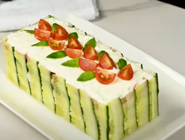 Огурцы положим в дуршлаг для отделения от сока. Выкладываем огурцы на сыр, полотно утрамбовываем, смазываем соусом. С помидором поступаем также - убираем лишнюю жидкость и ложем их последним слоем, покрываем соусом. Сверху украшаем резаными помидорами чили и листьями базилика. Украшать салатик можно на свое усмотрение. Готовый салат ставим в холодильник, форму снимаем перед подачей на стол. Приятного всем аппетита!