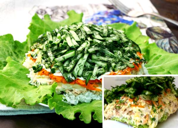 Переходим к формированию этого замечательного блюда. Листья салата мы будем использовать в качестве декора. Но, это не обязательно. Сверху на листья, первым слоем выкладываем основу, т.е. уже отваренный и немного подсоленный рис и еще совсем немного его присаливаем. Смазываем рис майонезом. Следующим слоем выкладываем горбушу и также смазываем майонезом, но, только тонким слоем. Сок из лука сливаем и отправляем его следующим слоем. Не смазывая лук майонезом, выкладываем морковь и только после этого все смазываем тонким слоем майонеза. Далее выкладываем огурец с измельченным укропом. Этот красивый, сочный салатик отправляем на час, полтора в холодильник и только перед подачей немного подсаливаем огурчики. Советуем всем приготовить этот шикарный салатик.