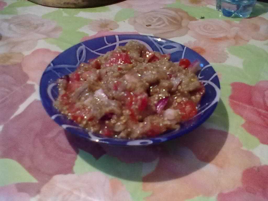 Вынуть с духовки, остудить, разрезать пополам и ножом вырезать мякоть. Хорошо порубить ее ножом и выложить в салатник. Помидор и лук нарезать мелко и положить также в салатник. Заправить маслом и солью по вкусу.