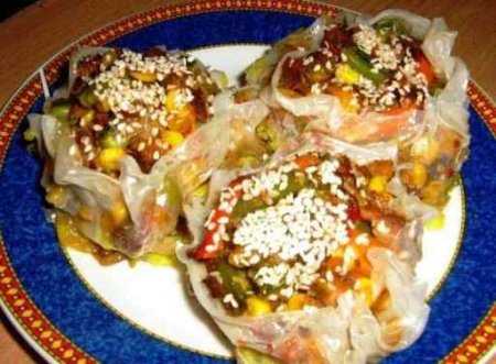 Овощи обжарить в небольшом количестве масла, все хорошо перемешать, добавить кипяченой воды и тушить до испарения жидкости. Рисовый бумага погрузить в теплую воду, подождать несколько секунд и выложить в очаге формы для кексов. Форму смазать маслом. В серединку кладем 1 ст.л. риса, затем примерно 1 ст.л. "С горкой" овощной смеси. Поднять кончики бумаги и как бы немного слепить их, сформировав корзины. В центр корзиночек насыпать кунжута, побрызгать соевым соусом и отправить на 10 минут в разогретую до 200 градусов духовку. Готовим корзинки дать остыть и достать из формы. Украсить зеленью.