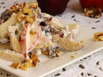 Яблоки нарезать кружками. Затем брусками. Положить нарезанные яблоки в миску. Добавить лимонный сок и перемешать, чтобы яблоки не потемнели. Нарезать сельдерей. Добавить в миску с яблоками. Добавить грецкие орехи. Добавить изюм. Добавить мед. Добавить йогурт и сметану. Тщательно все перемешать.
