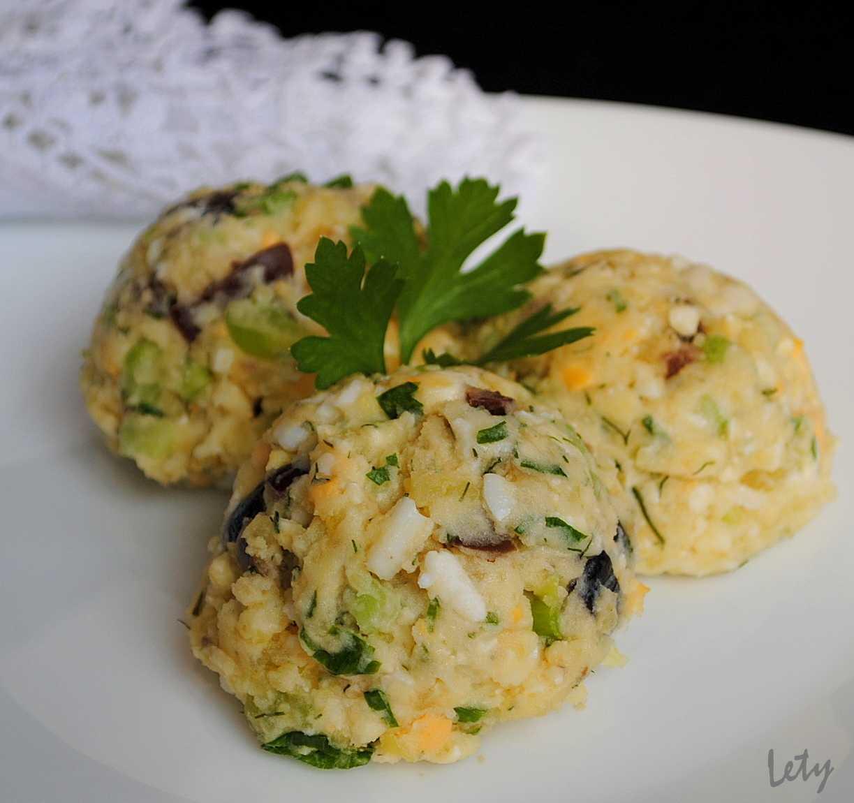 Добавить в пюре тертый сыр и яйца, огурец, нарезанный лук, петрушку, укроп и оливки.
