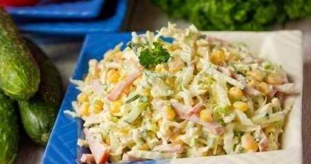 Для приготовления салата нам понадобится пекинская капуста, свежий огурец, ветчина колбаса ( или ветчина), кукуруза консервированная, зеленый лук, майонез, перец черный молотый, соль.