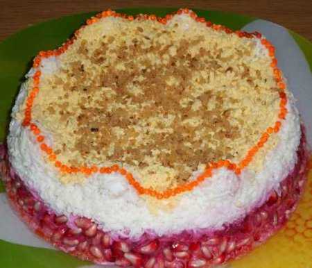 морковь, картофель, орехи, говядина, свекла, сыр. Каждый слой промазываем майонезом. Морковью, свеклой, орехами, картофелем стараемся вылепить форму короны. Сверху яичный белок, желток, орехи. Теперь можно потихоньку и не спеша украшать корону.