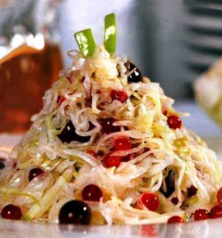 Вареный картофель нарезать соломкой. Лук репчатый нашинковать. Подготовленные продукты соединить с квашеной капустой, добавить клюкву, перемешать. Выложить в салатницу и заправить растительным маслом.