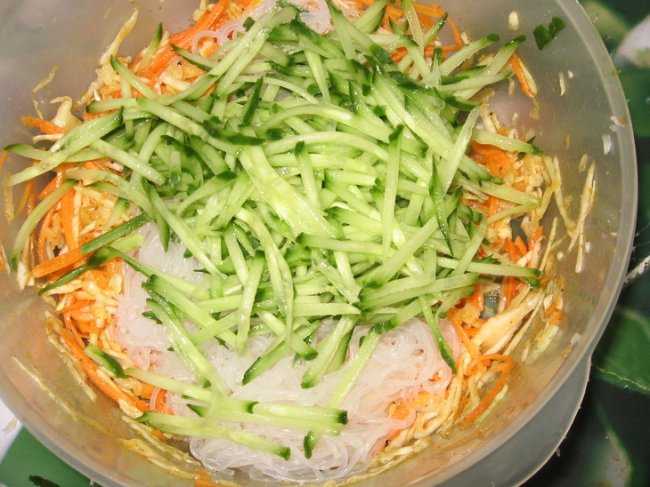 Лапшу отварить в кипятке 1 минуту, откинуть на дуршлаг и промыть холодной водой. Фасоль залить кипятком на 1 минуту, воду слить. Морковь натереть на терке, огурец тонко порезать соломкой.