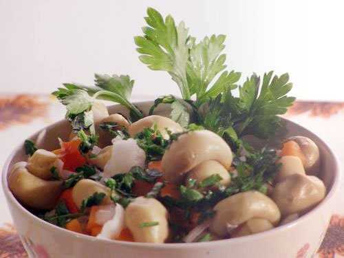 Смешать кукурузу (без жидкости) с кусочками сладкого перца, добавить резаный помидор, немного грибов кусочками.