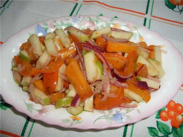 Из растительного масла, лимонного сока, соли, сахара сделать заливку. Хурму, лук, яблоко нарезать, перемешать, добавив заливку и поперчить. Можно выложить на листья салата, можно в салатницу, оставить на 15 минут, подать.