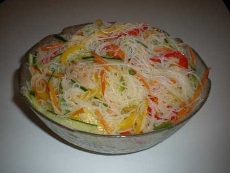 Как только пассированные морковь, перец и чеснок остынут, смешать их с лапшой и огурцом. Добавить уксус, соль по вкусу и сою (соевый соус).