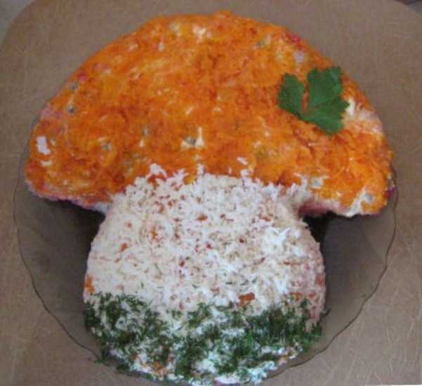 Отварить картофель, морковь и яйца. Грибы мелко порезать и обжарить с луком. Отварной картофель натереть на крупной терке. Вареную морковь натереть на крупной терке. Яйца – только белки – мелко порезать.