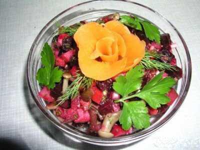 Перед подачей на стол винегрет сверху украсить грибами, листьями салата или свежей зеленью (петрушкой, укропом).