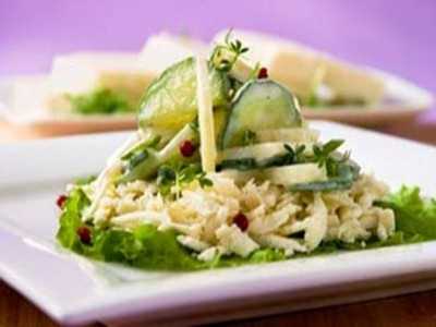 Огурцы нарезать кубиками. Яблоки, не очищая от кожуры, нарезать кубиками. Сыр нарезать кубиками.