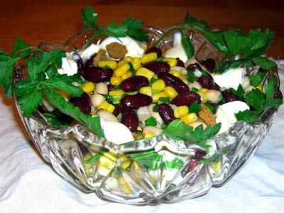 Смешать фасоль, кукурузу, сухарики, мелко нарезанный лук и майонез.