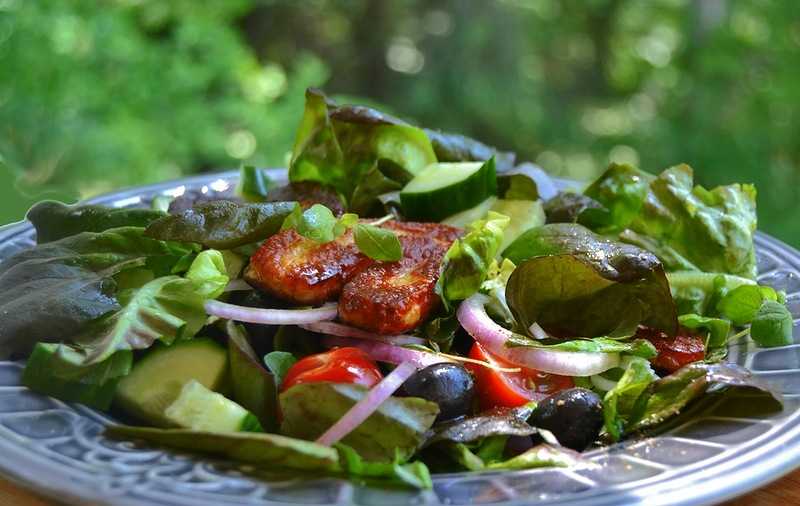Сыр халлуми порезать на кусочки, обвалять в яйце и сухарях и пожарить на оливковом масле с обеих сторон до румяной корочки.