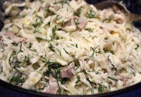 Мясо режем мелкими кусочками. Репчатый лук нужно немного спассеровать на масле. Теперь в салат нужно добавить сваренные вкрутую и мелко нарезанные яйца и зелень, посолить и заправить сметаной.