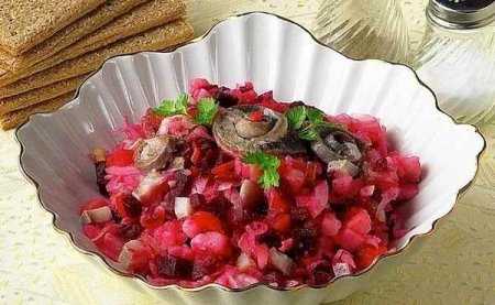 Для приготовления винегрета нужно взять филе соленой сельди, соленые огурцы, свекла, морковь, картофель, лук, квашеную капусту, растительное масло (или майонез) и соль. Свеклу, морковь и картофель отдельно залить кипятком и отварить до мягкости. Овощи охладить, очистить и нарезать мелкими кубиками. Капусту слегка порубить.