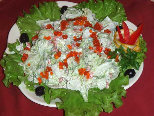 Салатную массу выложить на листья салата и украсить дольками лимона, красной икрой, маслинами.