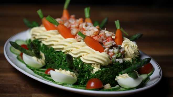 В миске перемешать порезанный кубиками вареные картофель, морковь, консервированный зеленый горошек, соленые огурцы, нарезанные сельдерей и рыбу. Залейте салат яичным соусом. Украсьте помидорами, морковкой, петрушкой, лимоном.